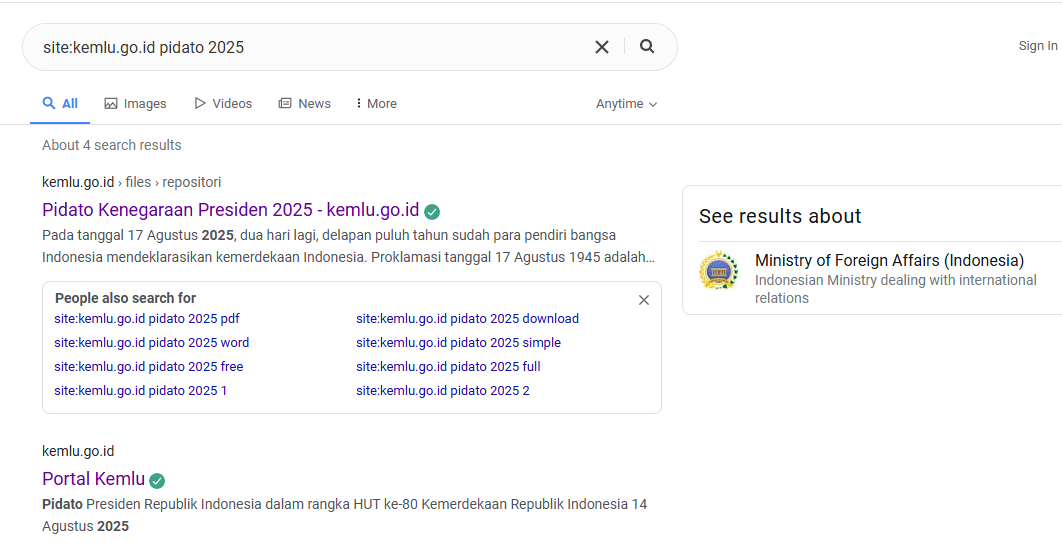 Cara ini membuat Google hanya menampilkan hasil dari Portal Kemlu saja, jadi nggak bakal nyasar ke blog atau berita hoax.