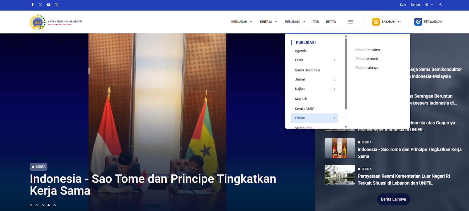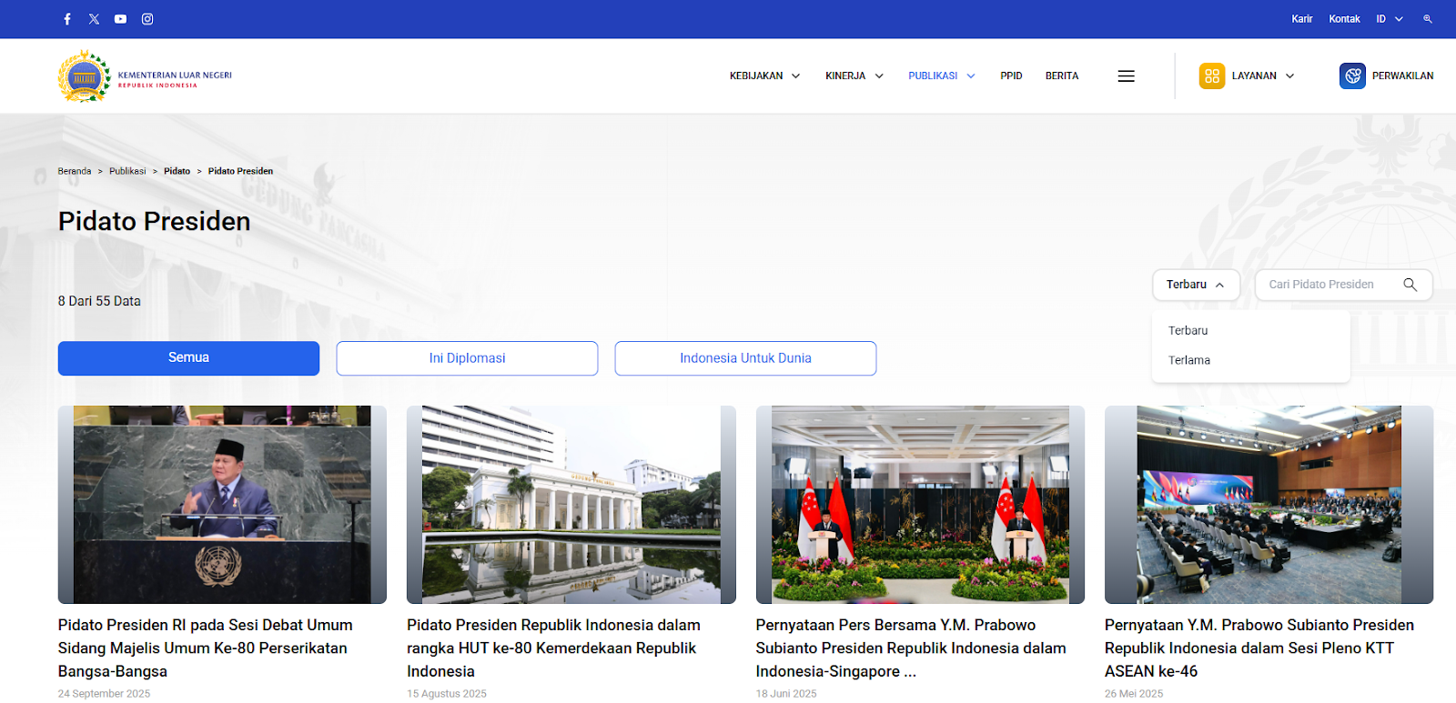 Pertama, akses Portal Kemlu melalui tautan kemlu.go.id lalu pilih menu publikasi dan klik kategori pidato (terdapat opsi kategori Pidato Presiden, Menteri, dan lainnya)