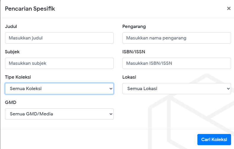 Fitur yang dimaksud adalah pencarian spesifik, yang memungkinkan pemustaka menelusuri koleksi secara lebih terarah dengan memanfaatkan berbagai filter yang tersedia. Melalui fitur ini, hasil pencarian ditampilkan secara lengkap, mulai dari pengarang, subjek, ISBN, ISSN, tipe koleksi, lokasi koleksi, tipe media.