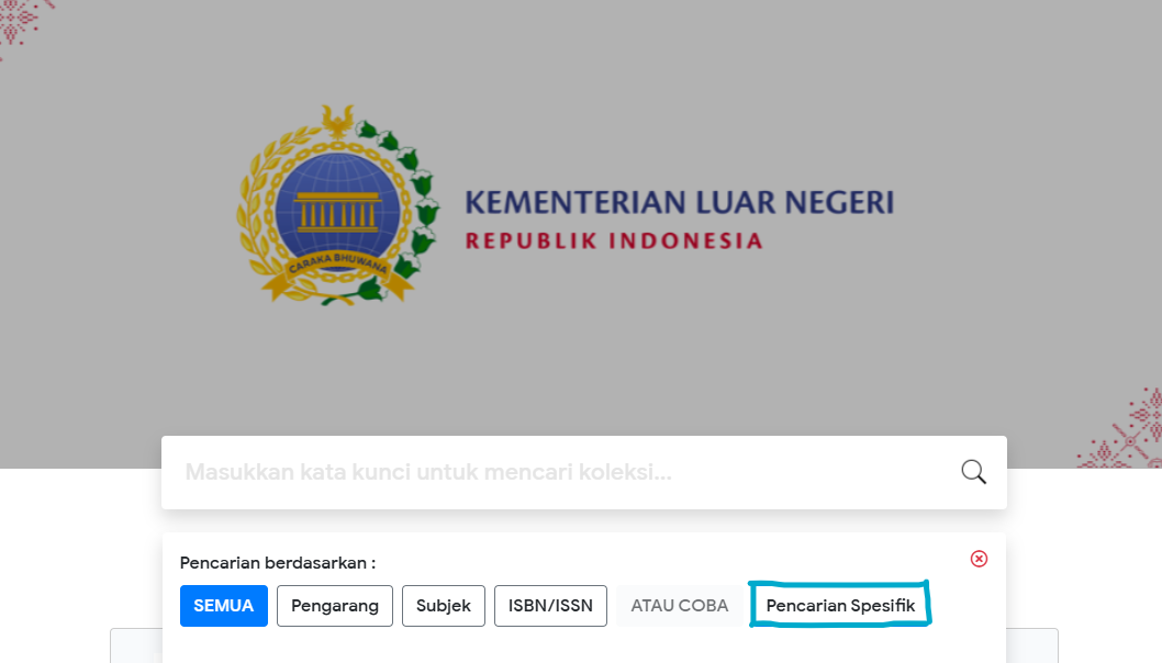 Berikut gambaran penggunaan pencarian spesifik pada halaman OPAC Perpustakaan Diplomasi: