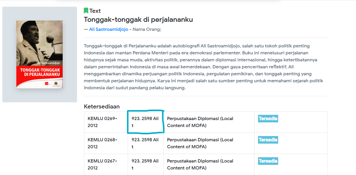 Pada koleksi ini, perlu kita ketahui nomor klasifikasi buku ini yaitu 923.2598, selanjutnya huruf Ali merupakan identitas dari pengarang buku tersebut dan huruf terakhir yaitu t merupakan huruf awal judul buku tersebut. Lokasi koleksi terdapat di Perpustakaan Diplomasi tepatnya pada rak local content of MOFA yang dimana merupakan koleksi terbitan Kementerian Luar Negeri.
