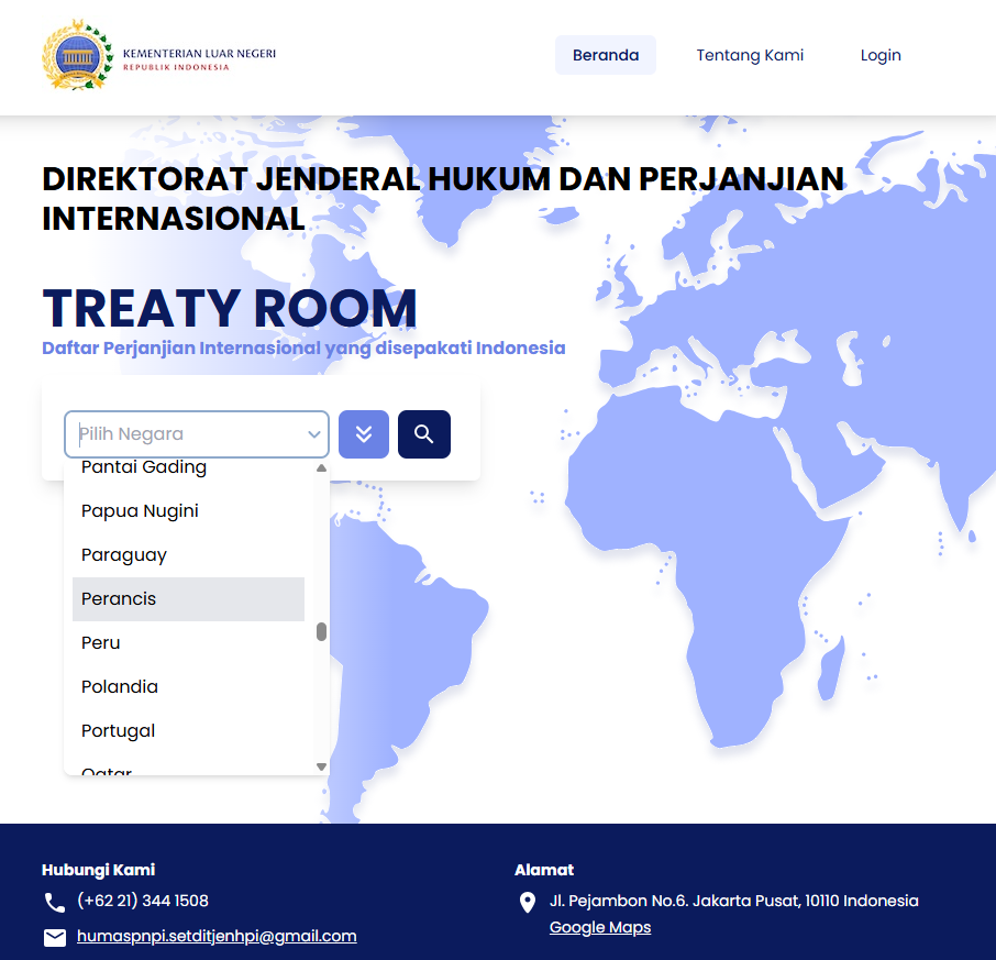 Untuk mengakses Treaty Room, dapat langsung klik link ini https://treaty-room.kemlu.go.id/ atau bisa cari di google dengan ketikan “Treaty Room Kemlu”. Setelah itu bisa dicari negara mana yang ingin dilihat perjanjian dengan Indonesia, contohnya, negara Perancis.